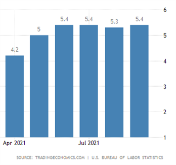 The annual inflation rate in the US edged up to a 13-year high of 5.4% in September of 2021 from 5.3% in August. |
