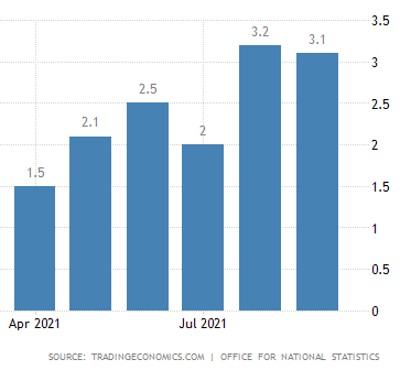 The annual inflation rate in the UK edged down to 3.1% in September of 2021 from a 9-year high of 3.2% in August and below forecasts of 3.2%. |