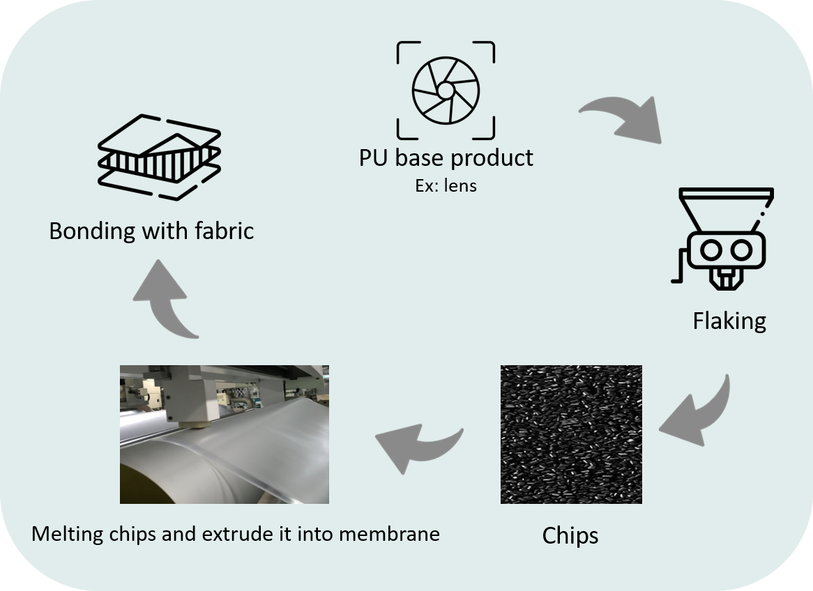 Produced by recycled consumer waste replacing petrochemical materials, it is easy to bond with any eco-friendly fabrics. It performs comparable tear strength and durability, with high function on waterproof and breathable. |